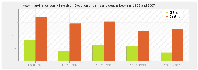 Teyssieu : evolution of births and deaths from 1968 to 2007