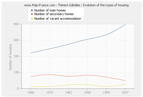 The following graphs show the history of the number and the type of housing of Thimert-Gâtelles from 1968 to 2007. The second graph is drawn in cubic interpolation. This allows to obtain more exactly the number of accommodation of the town of Thimert-Gâtelles years where no inventory was made.