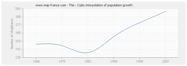 This curve shows the history of the population of This from 1968 to 2007 in cubic interpolation. This provides more precisely the population of the municipality of This the years where no census has been taken.