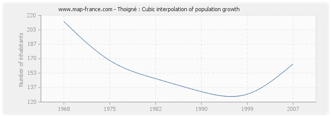 Population of Thoigné was 164 inhabitants in 2007, 129 inhabitants in 1999, 132 inhabitants in 1990, 147 inhabitants in 1982, 168 inhabitants in 1975 and 213 inhabitants in 1968.