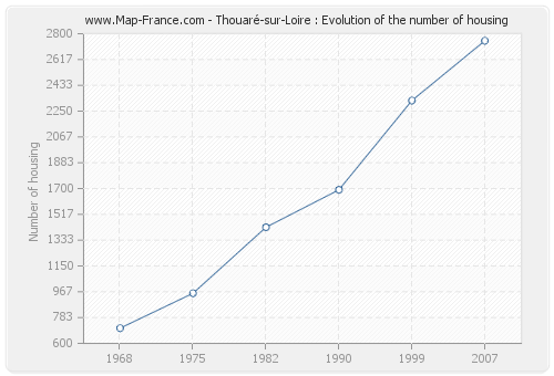 The population of Thouaré-sur-Loire was 7 407 inhabitants in 2007, 6 660 inhabitants in 1999, 5 140 inhabitants in 1990, 4 505 inhabitants in 1982, 2 887 inhabitants in 1975 and 1 974 inhabitants in 1968. Meanwhile, the number of housing of Thouaré-sur-Loire was 2 750 in 2007, 2 325 in 1999, 1 691 in 1990, 1 425 in 1982, 956 in 1975 and 708 in 1968.