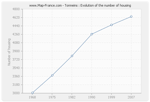 The number of housing of Tonneins was 4 641 in 2007, 4 463 in 1999, 4 265 in 1990, 3 798 in 1982, 3 382 in 1975 and 3 008 in 1968.