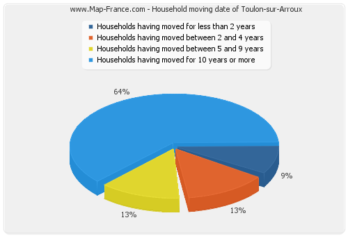 - Number of households of Toulon-sur-Arroux having moved between 2 and 5 years : 97 - Number of households of Toulon-sur-Arroux having moved between 5 and 9 years : 95 - Number of households of Toulon-sur-Arroux having moved for 10 years or more : 465 |