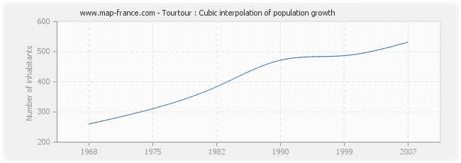 This curve shows the history of the population of Tourtour from 1968 to 2007 in cubic interpolation. This provides more precisely the population of the municipality of Tourtour the years where no census has been taken.