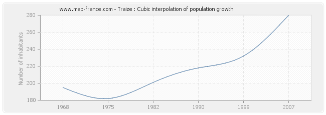 This curve shows the history of the population of Traize from 1968 to 2007 in cubic interpolation. This provides more precisely the population of the municipality of Traize the years where no census has been taken.