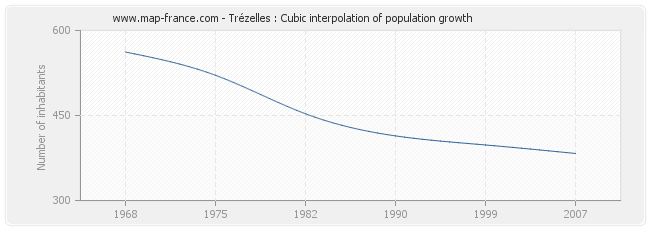 This curve shows the history of the population of Trézelles from 1968 to 2007 in cubic interpolation. This provides more precisely the population of the municipality of Trézelles the years where no census has been taken.