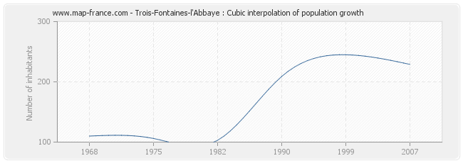 Population of Trois-Fontaines-l'Abbaye was 229 inhabitants in 2007, 245 inhabitants in 1999, 209 inhabitants in 1990, 103 inhabitants in 1982, 106 inhabitants in 1975 and 110 inhabitants in 1968.