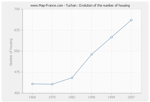 The number of housing of Tuchan was 661 in 2007, 600 in 1999, 539 in 1990, 455 in 1982, 432 in 1975 and 433 in 1968.