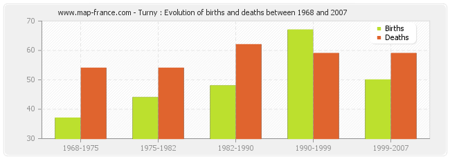 Population of Turny was 729 inhabitants in 2007, 785 inhabitants in 1999, 654 inhabitants in 1990, 562 inhabitants in 1982, 484 inhabitants in 1975 and 434 inhabitants in 1968.
