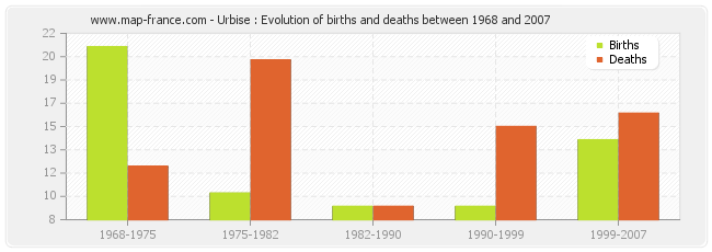 Population of Urbise was 129 inhabitants in 2007, 140 inhabitants in 1999, 152 inhabitants in 1990, 171 inhabitants in 1982, 191 inhabitants in 1975 and 247 inhabitants in 1968.