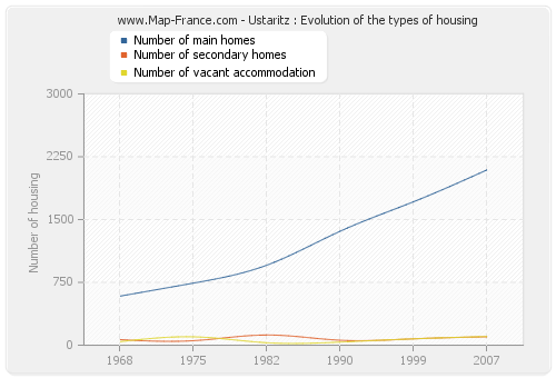 The following graphs show the history of the number and the type of housing of Ustaritz from 1968 to 2007. The second graph is drawn in cubic interpolation. This allows to obtain more exactly the number of accommodation of the city of Ustaritz years where no inventory was made.