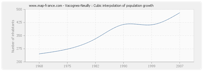Population of Vacognes-Neuilly was 481 inhabitants in 2007, 412 inhabitants in 1999, 414 inhabitants in 1990, 332 inhabitants in 1982, 273 inhabitants in 1975 and 246 inhabitants in 1968.