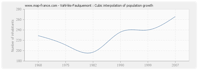 This curve shows the history of the population of Vahl-lès-Faulquemont from 1968 to 2007 in cubic interpolation. This provides more precisely the population of the municipality of Vahl-lès-Faulquemont the years where no census has been taken.