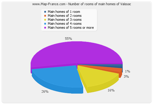 - Number of main homes of Vaïssac of 1 room : 4 - Number of main homes of Vaïssac of 2 rooms : 7 - Number of main homes of Vaïssac of 3 rooms : 43 - Number of main homes of Vaïssac of 4 rooms : 43 - Number of main homes of Vaïssac of 5 rooms and more : 150 |