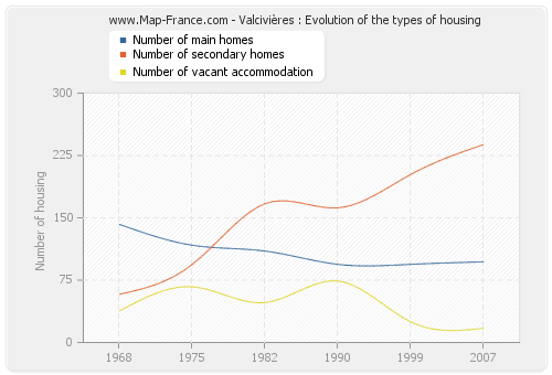 The number of housing of Valcivières was 352 in 2007, 321 in 1999, 330 in 1990, 325 in 1982, 278 in 1975 and 238 in 1968.
