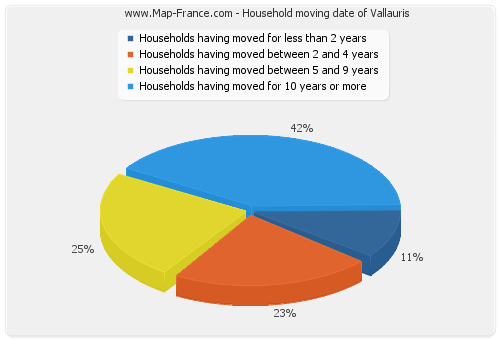 - Number of households of Vallauris having moved between 2 and 5 years : 2 959 - Number of households of Vallauris having moved between 5 and 9 years : 3 226 - Number of households of Vallauris having moved for 10 years or more : 5 426 |