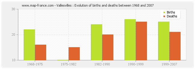 Vallesvilles : evolution of births and deaths from 1968 to 2007