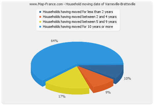- Number of households of Varneville-Bretteville having moved between 2 and 5 years : 10 - Number of households of Varneville-Bretteville having moved between 5 and 9 years : 19 - Number of households of Varneville-Bretteville having moved for 10 years or more : 71 |