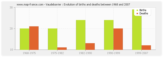 Vaudebarrier : evolution of births and deaths from 1968 to 2007
