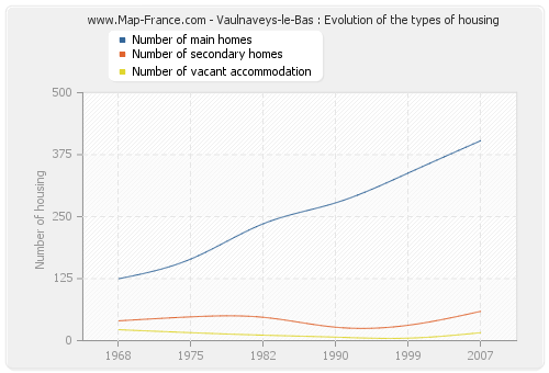 The following graphs show the history of the number and the type of housing of Vaulnaveys-le-Bas from 1968 to 2007. The second graph is drawn in cubic interpolation. This allows to obtain more exactly the number of accommodation of the town of Vaulnaveys-le-Bas years where no inventory was made.