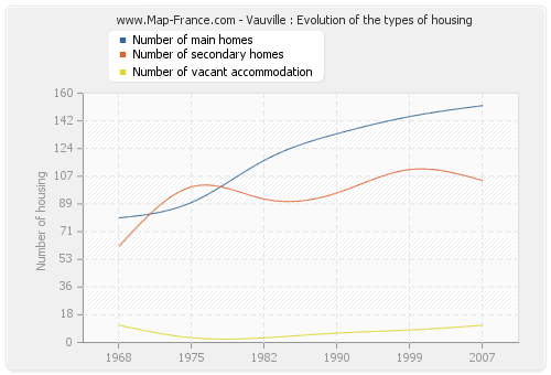 The following graphs show the history of the number and the type of housing of Vauville from 1968 to 2007. The second graph is drawn in cubic interpolation. This allows to obtain more exactly the number of accommodation of the town of Vauville years where no inventory was made.