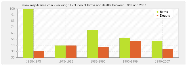 - Men inhabitants Veckring in 2007 were 336 - Women inhabitants in 2007 were 342