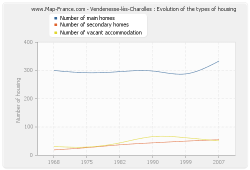 The following graphs show the history of the number and the type of housing of Vendenesse-lès-Charolles from 1968 to 2007. The second graph is drawn in cubic interpolation. This allows to obtain more exactly the number of accommodation of the town of Vendenesse-lès-Charolles years where no inventory was made.