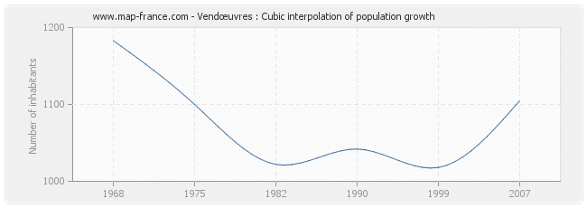 This curve shows the history of the population of Vendœuvres from 1968 to 2007 in cubic interpolation. This provides more precisely the population of the municipality of Vendœuvres the years where no census has been taken.