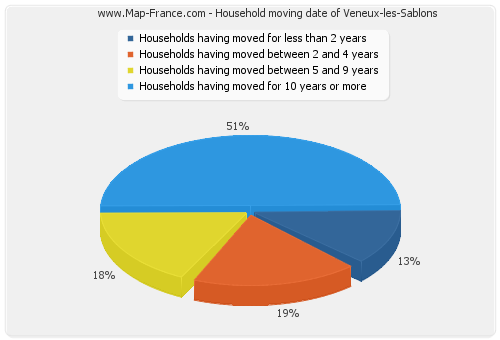- Number of households of Veneux-les-Sablons having moved between 2 and 5 years : 392 - Number of households of Veneux-les-Sablons having moved between 5 and 9 years : 372 - Number of households of Veneux-les-Sablons having moved for 10 years or more : 1 056 |