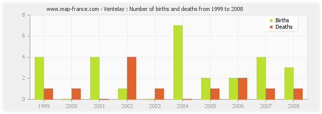 Ventelay : evolution of births and deaths from 1968 to 2007