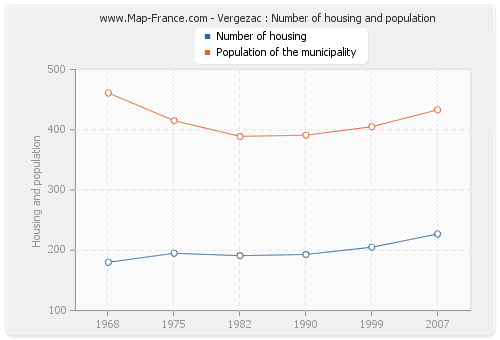 The population of Vergezac was 433 inhabitants in 2007, 405 inhabitants in 1999, 391 inhabitants in 1990, 389 inhabitants in 1982, 415 inhabitants in 1975 and 461 inhabitants in 1968. Meanwhile, the number of housing of Vergezac was 227 in 2007, 205 in 1999, 193 in 1990, 191 in 1982, 195 in 1975 and 180 in 1968.