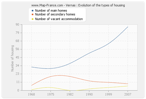 The number of housing of Vernas was 102 in 2007, 79 in 1999, 66 in 1990, 56 in 1982, 53 in 1975 and 40 in 1968.