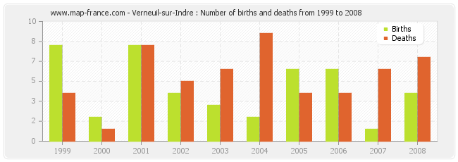 Verneuil-sur-Indre : births and deaths from 1999 to 2008