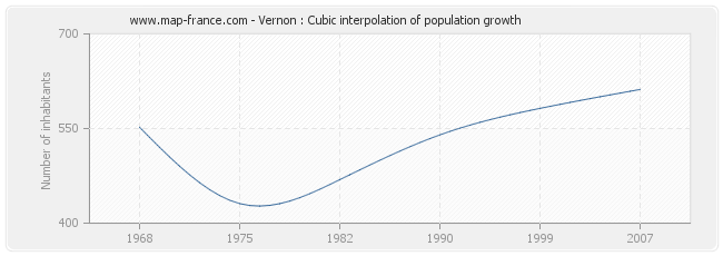 This curve shows the history of the population of Vernon from 1968 to 2007 in cubic interpolation. This provides more precisely the population of the municipality of Vernon the years where no census has been taken.
