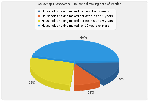 - Number of households of Vézillon having moved between 2 and 5 years : 10 - Number of households of Vézillon having moved between 5 and 9 years : 27 - Number of households of Vézillon having moved for 10 years or more : 44 |