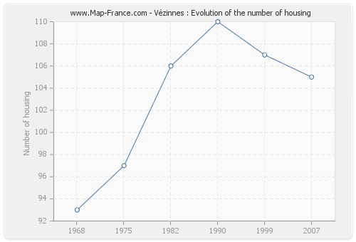 The number of housing of Vézinnes was 105 in 2007, 107 in 1999, 110 in 1990, 106 in 1982, 97 in 1975 and 93 in 1968.