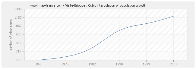This curve shows the history of the population of Vieille-Brioude from 1968 to 2007 in cubic interpolation. This provides more precisely the population of the municipality of Vieille-Brioude the years where no census has been taken.