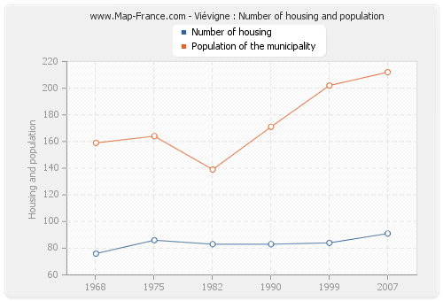 The population of Viévigne was 212 inhabitants in 2007, 202 inhabitants in 1999, 171 inhabitants in 1990, 139 inhabitants in 1982, 164 inhabitants in 1975 and 159 inhabitants in 1968. Meanwhile, the number of housing of Viévigne was 91 in 2007, 84 in 1999, 83 in 1990, 83 in 1982, 86 in 1975 and 76 in 1968.