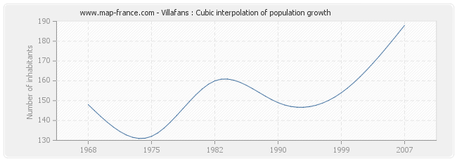 This curve shows the history of the population of Villafans from 1968 to 2007 in cubic interpolation. This provides more precisely the population of the municipality of Villafans the years where no census has been taken.
