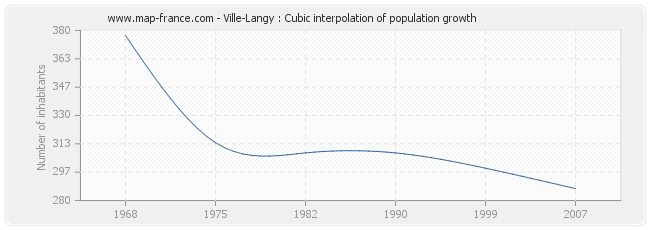 This curve shows the history of the population of Ville-Langy from 1968 to 2007 in cubic interpolation. This provides more precisely the population of the municipality of Ville-Langy the years where no census has been taken.