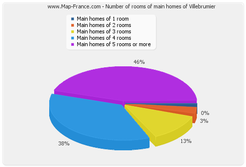 - Number of main homes of Villebrumier of 1 room : 1 - Number of main homes of Villebrumier of 2 rooms : 13 - Number of main homes of Villebrumier of 3 rooms : 57 - Number of main homes of Villebrumier of 4 rooms : 57 - Number of main homes of Villebrumier of 5 rooms and more : 203 |
