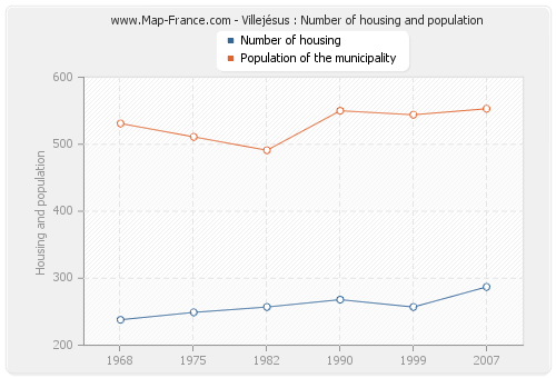 The population of Villejésus was 553 inhabitants in 2007, 544 inhabitants in 1999, 550 inhabitants in 1990, 491 inhabitants in 1982, 511 inhabitants in 1975 and 531 inhabitants in 1968. Meanwhile, the number of housing of Villejésus was 287 in 2007, 257 in 1999, 268 in 1990, 257 in 1982, 249 in 1975 and 238 in 1968.