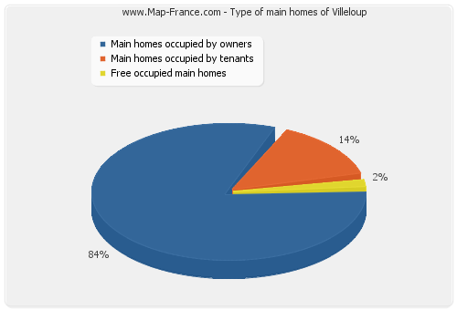 - Number of main homes of Villeloup occupied by owners : 47 - Number of main homes of Villeloup occupied by tenants : 8 - Number of main homes of Villeloup occupied free of charge : 1 |