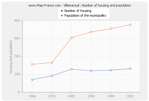 The population of Villemareuil was 377 inhabitants in 2007, 355 inhabitants in 1999, 337 inhabitants in 1990, 305 inhabitants in 1982, 166 inhabitants in 1975 and 156 inhabitants in 1968. Meanwhile, the number of housing of Villemareuil was 132 in 2007, 123 in 1999, 120 in 1990, 129 in 1982, 92 in 1975 and 70 in 1968.