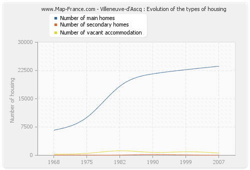 The number of housing of Villeneuve-d'Ascq was 24 252 in 2007, 23 728 in 1999, 22 569 in 1990, 19 613 in 1982, 10 655 in 1975 and 6 998 in 1968.