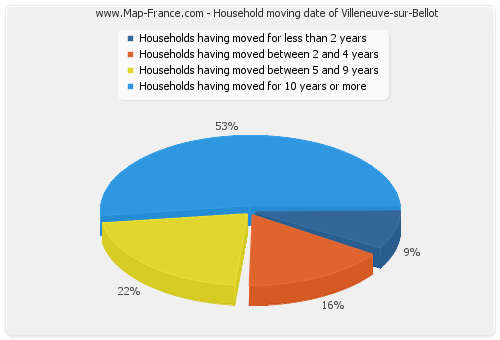 - Number of households of Villeneuve-sur-Bellot having moved between 2 and 5 years : 72 - Number of households of Villeneuve-sur-Bellot having moved between 5 and 9 years : 97 - Number of households of Villeneuve-sur-Bellot having moved for 10 years or more : 234 |