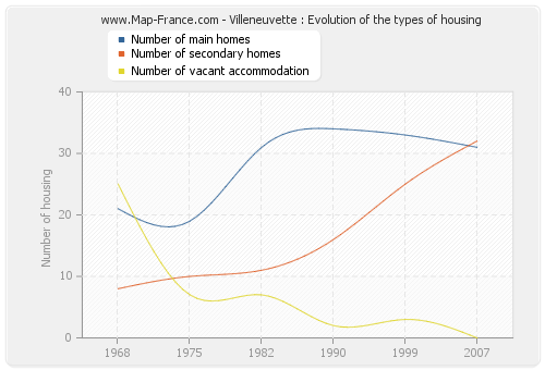 The following graphs show the history of the number and the type of housing of Villeneuvette from 1968 to 2007. The second graph is drawn in cubic interpolation. This allows to obtain more exactly the number of accommodation of the town of Villeneuvette years where no inventory was made.