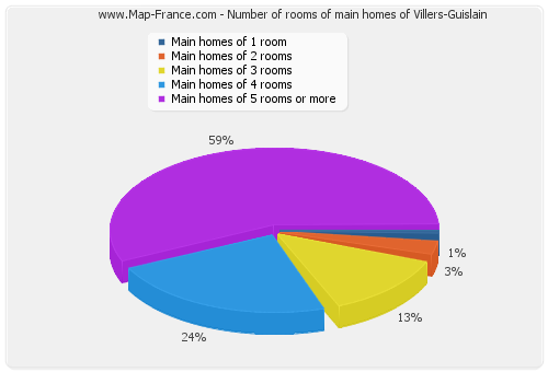 - Number of main homes of Villers-Guislain of 1 room : 2 - Number of main homes of Villers-Guislain of 2 rooms : 8 - Number of main homes of Villers-Guislain of 3 rooms : 37 - Number of main homes of Villers-Guislain of 4 rooms : 37 - Number of main homes of Villers-Guislain of 5 rooms and more : 163 |