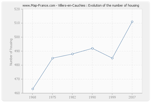 The number of housing of Villers-en-Cauchies was 511 in 2007, 485 in 1999, 492 in 1990, 488 in 1982, 485 in 1975 and 463 in 1968.
