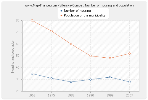 The population of Villers-la-Combe was 52 inhabitants in 2007, 48 inhabitants in 1999, 50 inhabitants in 1990, 60 inhabitants in 1982, 71 inhabitants in 1975 and 80 inhabitants in 1968. Meanwhile, the number of housing of Villers-la-Combe was 28 in 2007, 32 in 1999, 30 in 1990, 28 in 1982, 31 in 1975 and 35 in 1968.